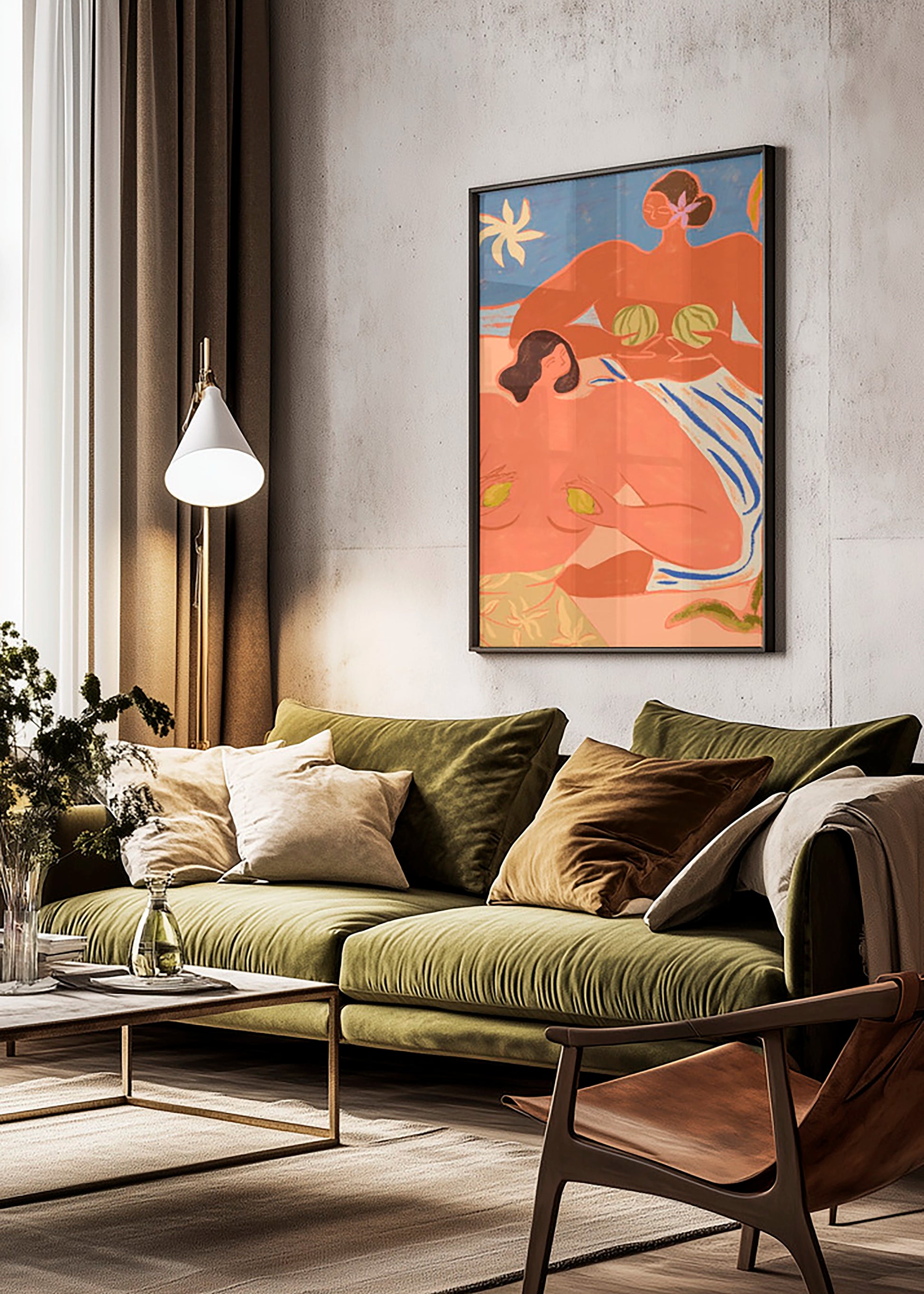 Färgpaletten domineras av varma nyanser av orange, korall och beige, kontrasterade av friskt grönt och intensivt koboltblått. Tillsammans skapar färgerna en känsla av både värme och friskhet, vilket gör postern perfekt för interiörer som vågar färg och personlighet. Oavsett om ditt hem präglas av skandinavisk enkelhet med ljusa trämaterial eller en mer bohemisk stil med eklektiska detaljer, blir Lemon and Melon ett uttrycksfullt blickfång.