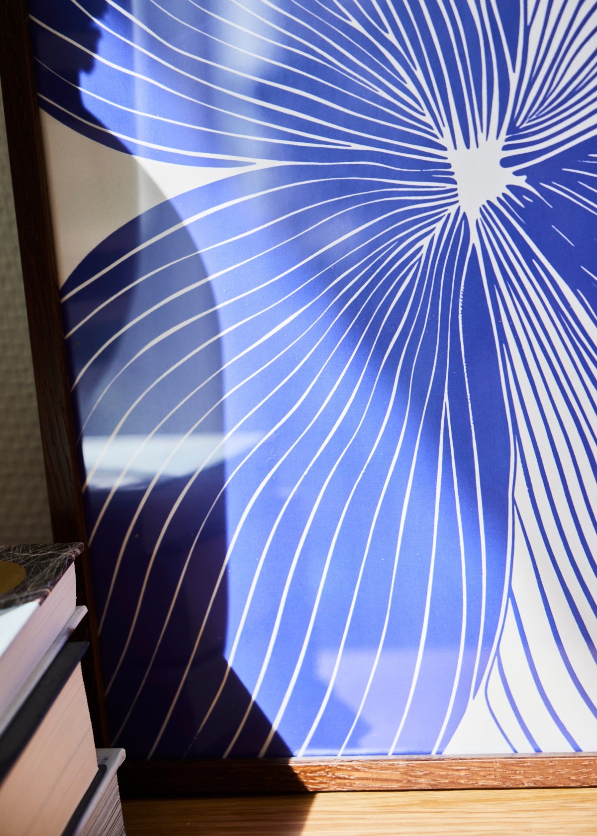 Shape no. 20 är en fängslande grafisk poster som leker med symmetri, rörelse och balans. De djärva, organiska formerna i djupt indigoblått och offwhite bildar ett mönster som påminner om blomblad eller en solfjäder som långsamt vecklas ut. Tunna vita linjer strålar ut från mitten och skapar ett nästan hypnotiskt flöde som för tankarna till både natur och precision.